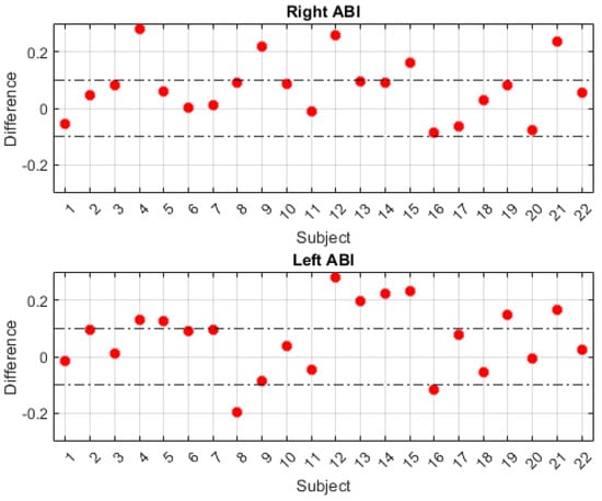 In order to improve the visualization of the obtained ABI results, it is suggested to generate a comparative graph of the results obtained with the two calculation methods. This comparison is shown in Figure 10. The abscissa axis represents the 22 patients, and the ordinate axis represents the difference between the ABI results obtained with the traditional method and those obtained with the developed system. In order to evaluate the degree of agreement between the two measurement methods, a range of ±0.1 difference is established to determine the degree of accuracy and variability of the proposed system. In the graphs, a horizontal line is included to delimit the defined difference range, which facilitates the identification of the number of results within and outside the established tolerance interval. The upper part of the figure represents the difference between the data obtained from the right ABI, while the lower part shows the difference between the data obtained from the left ABI.