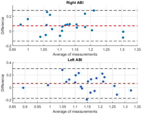 Bland–Altman plot comparing the ABI obtained with the traditional method and the ABI calculated with the developed system. The red lines represent the mean of the differences between the methods, while the black lines indicate the limits of agreement, the blue dots represent the difference between the results obtained with the two methods compared to the mean of these results.
