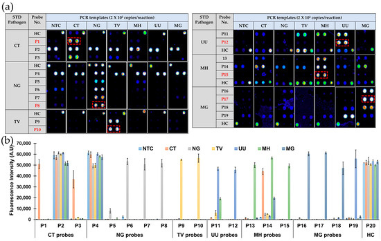 (a) Results of hybridization of the PCR products of STD pathogens with the immobilized probes corresponding to each STD pathogen; (b) Bar graph representing corresponding signal intensities. The values represent the mean and standard deviation of three replicates. (NTC, Negative control). Text in red font and red boxes indicate optimum probes selected for further study.