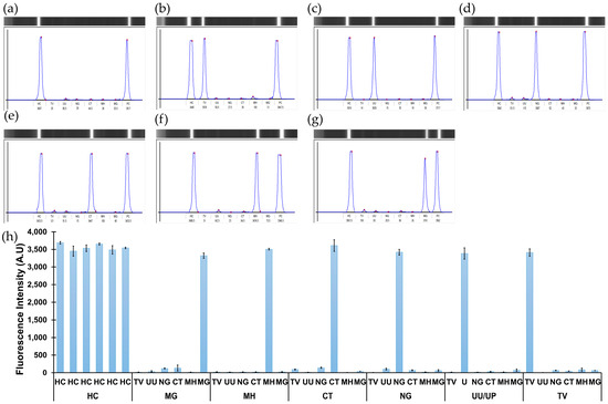 Results of detection and genotyping of (a) negative control; (b) TV; (c) UU; (d) NG; (e) CT; (f) MH and (g) MG on 6STD Genotyping 9G Membranes using the PCR products of respective genotypes (genomic DNA template, 1 × 105 copies/test) and the multiplex PCR primer mixture; (h) bar graph representing corresponding signal intensities. The values represent the mean and standard deviation of 24 replicates.