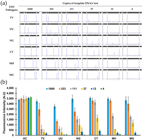 Results of detection and genotyping of (a) TV, UU, NG, CT, MH, and MG pathogens on the 6STD Genotyping 9G Membranes using the PCR products obtained from 1000, 333, 111, 37, 12, and 4 copies/test of template DNAs of respective pathogens; (b) bar graph representing corresponding signal intensities. The values represent the mean and standard deviation of 24 replicates.