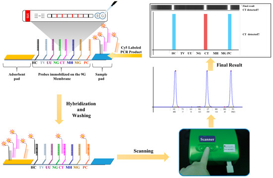Scheme depicting the workflow and the respective positions of the probes corresponding to CT, NG, TV, UU, MH, MG, PC, and HC on the 6STD Genotyping 9G Membrane, an LFSM.