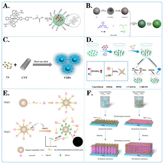 Wan-Sheng Tang and colleagues [64] prepared quantum dot-encoded maleic anhydride-grafted PLA (PLA-MA) fluorescent microspheres by embedding CdSe/ZnS quantum dots in PLA-MA using the Shirasu porous glass (SPG) membrane emulsification technique. The microspheres were characterized by high fluorescence intensity, good stability, and good dispersion. Fluorescence immunoassay of the test strips revealed that the PLA-MA microspheres have high bioactivity and good stability, which is favorable for immunoassays. Qiaoli Jin and others [65] first synthesized 13 nm CuInZnS/ZnS QDs with DDT ligands, and then CuInZnS/ZnS microbeads (QBs) containing thousands of QDs were successfully prepared by a two-step method of emulsion-solvent evaporation and surfactant substitution. By emulsion-solvent evaporation, CuInZnS/ZnS QDs were formed into microbeads in a microemulsion with dodecyltrimethylammonium bromide (DTAB), and Förster resonance energy transfer (FRET) was effectively overcome. Then, CO-520 was introduced to replace DTAB to improve its stability and water solubility. Finally, highly fluorescent and stable CuInZnS/ZnS QBs were successfully constructed by coating the microbeads with SiO2 shells and carboxylating them. Yaofeng Zhou and colleagues [66], on the other hand, dissolved octadecylamine-coated CdSe/ZnS QDs in aqueous solutions of cyclohexane and SDS and emulsified them with an ultrasonic generator before evaporation and centrifugation, followed by the addition of NaHCO3 solution overnight. Finally, purified carboxylated quantum dot nanobeads (QBs) were obtained by centrifugation.