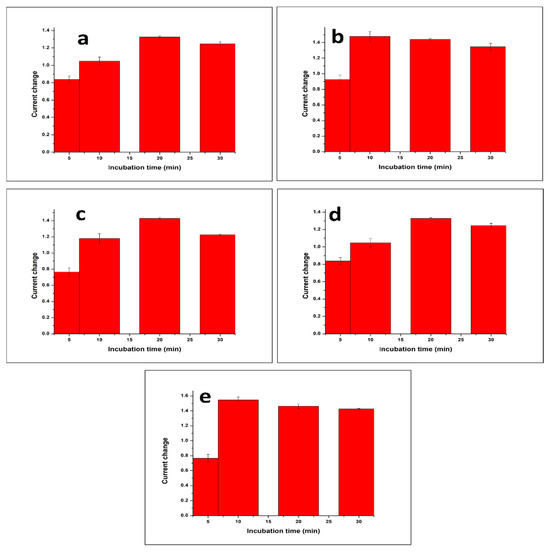 The incubation time of an aptamer with its analyte plays a key role in the performance of an aptasensor. We studied the effect of this factor on the electrochemical response of our multiplexed array. Each electrode was incubated with a fixed concentration of its specific analyte for different periods varying from 5 to 30 min. The array aptasensor responses were calculated by determining the current peak change after binding with the cyanotoxins. Figure 2a–e show the relation between the biosensor responses and the incubation time for MC-LR, CYL, anatoxin-α, saxitoxin and OA, respectively. For the OA and CYL aptasensors, the best response was obtained after 10 min of incubation. After that, no significant increase was noted. For saxitoxin and anatoxin, the signal increased until 20 min. After that, the electrochemical response started to decrease. However, the electrochemical response clearly increased with increasing incubation time for microcystin, but the increase after 20 min was not significant. Therefore, 20 min was chosen as the optimal recognition time in the subsequent experiments. Triplicate measurements were performed for all tests.