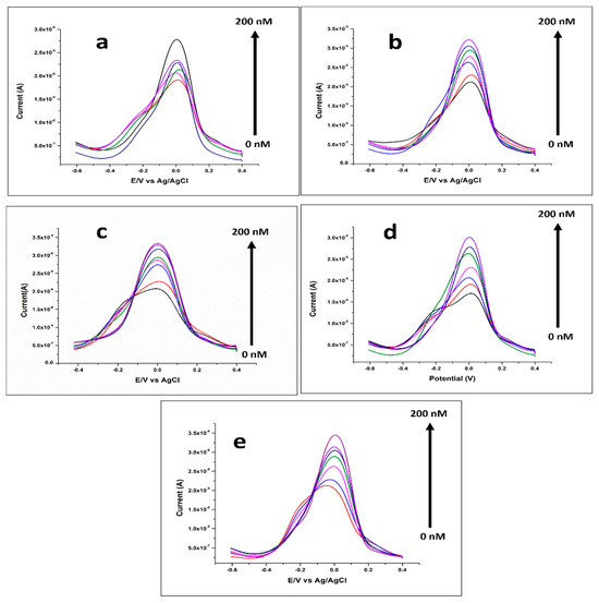 To study the response of the multiplexed aptasensing platform at different concentrations of the targeted cyanotoxins, each functionalized electrode was incubated with increasing amounts of the corresponding analyte. For that, the proposed array was incubated with MC-LR, CYL, anatoxin-α, saxitoxin and OA in the range of 18 pM to 200 nM for 20 min. Then, multi-toxin recognition by their specific aptamers was studied by monitoring the reduction of the [Fe(CN)6]3/4− redox system using SWV. Figure 3a–e show the obtained voltammograms for the five aptamer-functionalized electrodes before and after incubation with the toxins within the mentioned range of concentrations. As can be seen, the formation of the aptamer–toxin complex on the five electrodes of the multiplexed array induces a change in the voltametric signal as registered by an increase in the SWV peak currents (ip). We noted that the reduction peak clearly increased with increasing target concentration until the concentration of 200 nM. The observed behavior is in good agreement with previous aptasensors developed for cyanotoxin electrochemical sensing [25,32]. This is commonly explained by the conformational change of the aptamer upon toxin binding, inducing an increase in electron transfer.