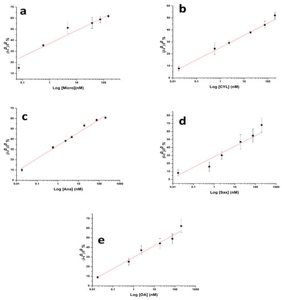 The obtained responses for each aptasensor were used to plot five calibration curves at varying concentrations of the targeted toxins. For that, the reduction peak current decrease rate ((i − i0)/i0 %) was calculated for each modified carbon electrode array (SPCE/AuNPs/APT) before (i0) and after (i) toxin binding. Figure 4a–e show the calibration curves of the five aptasensors in a plot of ((i − i0)/i0 %) as a function of the logarithm of toxin concentration. The calibration curves show good linearity with an excellent coefficient of determination (R2) and low detection limits (LODs) for the detection of the five toxins. The MC-LR aptasensor was applicable in the range of 0.073–150 nM, where the linear regression was ((i − i0)/i0 %) = 37.05 + 11.79 Log MC-LR concentration (nM) and the correlation coefficient R2 was equal to 0.95905. For CYL, the obtained linearity was within the range of 0.018 to 200 nM, where the linear regression was ((i − i0)/i0 %) = 25.28 + 10.17 Log CYL concentration (nM) and R2 was equal to 0.99231. The linear range of anatoxin was from 0.018 nM to 200 nM, where the linear regression was ((i − i0)/i0 %) = 33.82 + 12.61 Log anatoxin concentration (nM) and R2 was equal to 0.98766. The linear correlation for saxitoxin was in the range of 0.018 to 200 nM, where the linear regression was ((i − i0)/i0 %) = 28.41 + 13.18 Log saxitoxin concentration (nM) and R2 was equal to 0.91701. Finally, the OA analytical range was from 0.018 to 200 nM with the equation ((i − i0)/i0 %) = 29.73 + 11.96 Log OA concentration (nM) and R2 = 0.98881.