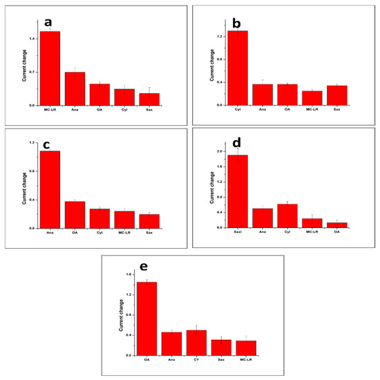Selectivity studies of the multiplexed aptasensor. Cross reactivity of MC-LR (a), CYL (b), anatoxin-α (c), saxitoxin (d) and OA (e) aptasensors toward non-specific cyanotoxins (concentration of 100 nM). The current change was calculated as i0 − i, where i0 and i correspond to the current peak before and after incubation with the specific and non-specific cyanotoxins.