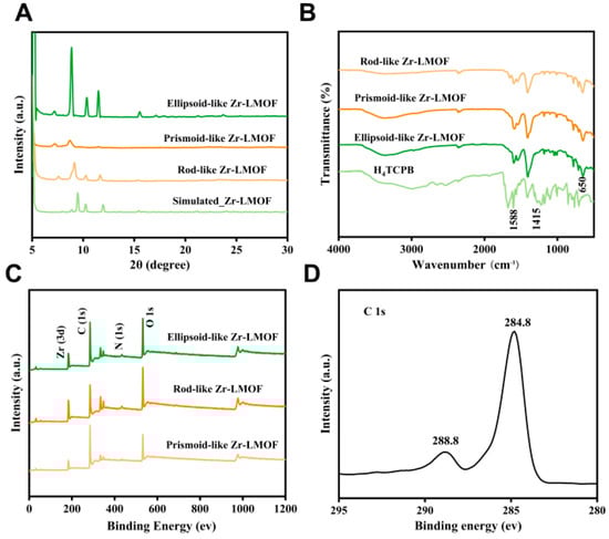 (A) Powder XRD pattern of Zr-LMOFs, (B) FT-IR spectra of Zr-LMOFs and H4TCPB, (C) XPS survey spectrum of Zr-LMOFs, and (D) XPS spectrum of C 1s regions of ellipsoid-like Zr-LMOF.