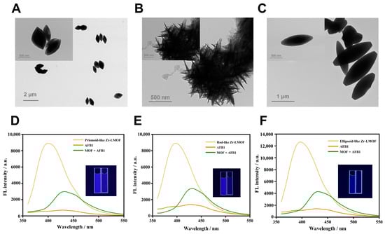 TEM images of (A) prismoid-like Zr-LMOF, (B) rod-like Zr-LMOF, and (C) ellipsoid-like Zr-LMOF. The fluorescence emission spectra of three Zr-LMOFs with 50 μM AFB1 from (D–F) (the inset shows Zr-LMOF (left) with Zr-LMOF + AFB1 (right) under 302 nm UV irradiation).