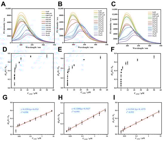 Fluorescence spectra and the corresponding standard curves of three Zr-LMOFs in the presence of different concentrations of AFB1. Fluorescence spectra of (A) prismoid-like Zr-LMOF, (B) rod-like Zr-LMOF, and (C) ellipsoid-like Zr-LMOF and (G–I) the corresponding calibration curves at low target concentrations from (D–F), respectively. Fluorescence spectra were recorded with the excitation of 340 nm. Error bars were obtained from three repeats.