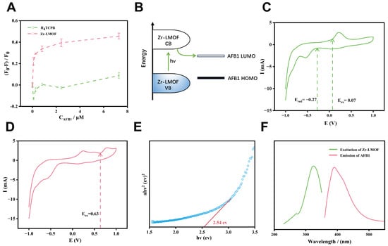 The quenching of the Zr-LMOF emission by AFB1 is likely due to an electron transfer mechanism that Pramanik et al. previously discussed for LMOF-based sensors []. If the lowest unoccupied molecular orbital energy level (LUMO) of electron-rich Zr-LMOF is higher than that of the analyte, the excited electrons of Zr-LMOF can move to the analyte’s LUMO through electron transfer, leading to quenching (Figure 4B). To validate it, electrochemical cyclic voltammetry was performed to assess the energy levels of Zr-LMOF and AFB1 (Figure 4C–E). The highest occupied molecular orbital (HOMO) and LUMO of ellipsoid-like Zr-LMOF were −4.70 eV and −2.12 eV, while those of AFB1 were −11.83 eV and −9.68 eV [] (Table S5). Therefore, electrons from Zr-LMOF in an excited state can transfer to the LUMO of AFB1, resulting in fluorescence quenching. Energy transfer often contributes significantly to fluorescence quenching and should also be considered. As can be seen in Figure 4F, the spectral overlap between the AFB1 absorption and Zr-LMOF emission is very limited, which hinders the energy transfer from Zr-LMOF to AFB1, indicating that it does not likely play a role in mycotoxin detection.