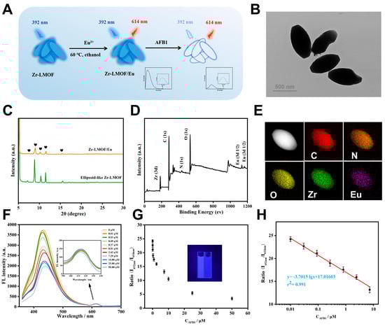 (A) Schematic diagram for the application of Zr-LMOF/Eu in AFB1 detection. (B) TEM image of Zr-LMOF/Eu. (C) Power XRD patterns of Zr-LMOF/Eu. (D) XPS survey spectrum of Zr-LMOF/Eu. (E) EDS elemental mapping images of Zr-LMOF/Eu. (F) Fluorescence emission spectra of Zr-LMOF/Eu with different concentrations of AFB1 (0–50 μM). (G) Corresponding relationship and (H) standard curve between the ratio of I432 nm/I614 nm and the AFB1 concentration.