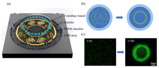 Therefore, various passive and active technical strategies are developed to enhance vortex intensity to meet the needs of microfluidic centrifugation applications [7]. Passive microfluidic centrifugation technology primarily relies on the design of microchannels with specific geometric shapes, topological structures, or curvatures. This design induces vortices by utilizing the principles of inertial fluid mechanics [8,9]. Although these designs are simple and low-cost, maintaining effective fluid dynamics often requires the use of high-power pumps, which is not conducive to the miniaturization and overall integration of microfluidic control devices. In contrast, active methods depend on externally applied forces to drive the rotation within the system. These forces typically originate from electric fields [10,11], acoustic fields [12,13,14], and thermal fields [15]. Compared to passive methods, active methods have the advantage of real-time, precise control of vortex intensity, direction, and distribution. They are adaptable to complex, dynamic operational requirements and offer high flexibility [16,17].