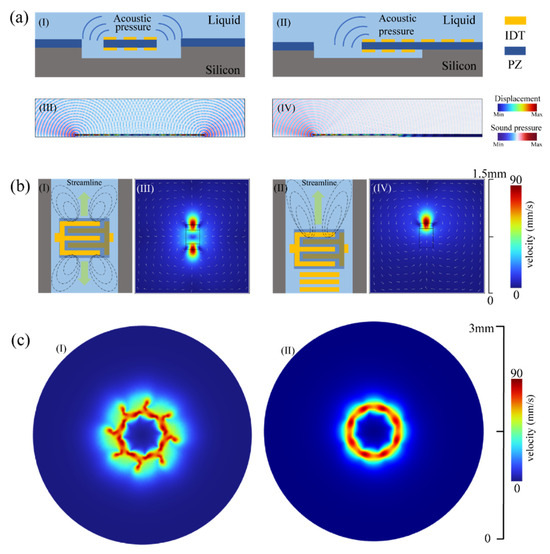 As observed in Ⅰ and Ⅲ of Figure 2b, the strongest acoustic streaming effect occurs in the vicinity of the resonator device, diminishing with increasing distance from the device, consistent with the attenuation of acoustic waves in the fluid domain and the finite extent of the volume force. Under the influence of acoustic streaming, the fluid flows along the x-axis away from the device center towards both sides, followed by fluid movement along the y-axis towards the center, replenishing the displaced fluid. A circulation forms within the liquid, with a vortex present at the corners of the LWR. In contrast, as seen in Ⅱ and Ⅳ of Figure 2b, the adoption of an air-grating structure on one side renders the direction of acoustic wave leakage into the fluid unidirectional, generating volume force on only that side. Concurrently, the fluid intensity and gradient on the air-grating side have increased. Due to the unidirectionality of the volume force, the fluid moves along the y-axis in the direction of acoustic wave propagation, returning to the rear of the resonator, creating vortices on both sides. This configuration results in a more concentrated energy distribution and a reduction in the formation of secondary vortices.