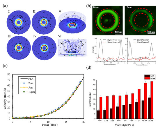 However, due to the presence of a single-sided reflector grating at ultra-high frequencies and the cooperation of a ring array, a larger portion of energy is rapidly converted, driving faster vortex motion. As a result, the CF acting on particles in the fluid rapidly increases and becomes dominant. Initially, particles move along streamlines towards the acoustic vortex center under the combined influence of CF and ARF. Upon reaching the virtual tunnel, the CF rapidly decreases. While the ARF pushes particles towards the center of the acoustic vortex, the enhanced CF acts in opposition, pushing particles away from the center. A stable particle ring forms where CF ≈ ARF, achieving an equilibrium state.As depicted in Figure 3a, for the simulation of particle enrichment by the UFCT, the chamber radius was set to 1.5 mm with a height of 1 mm. Subfigures (I–VI) illustrate the particle tracking simulation from initiation until the completion of enrichment, with time points at 0 s, 10 s, 20 s, and 30 s, respectively. Evidently, particles progressively accumulate from the edges towards the center. A dynamic visualization of this process can be found in the GIF S1. Figure 3a (V) and (VI) represent the oblique and side views of particle accumulation after enrichment. Particles are concentrated in a track approximately 300 μm above the device, a height that correlates with the attenuation distance of the acoustic waves generated by the device. Consequently, and ARF jointly govern the ring-like motion of particles around a specific acoustic vortex streamline. The results obtained are similar to those of previous reports [29,41], but the supplied power of UFCT is found to be an order of magnitude lower. For specific comparisons, please refer to Table S1. Subsequently, the enrichment effect of UFCT on particles of different sizes (2 μm and 10 μm) was characterized by measuring the fluorescence intensity before and after UFCT activation, as shown in Figure 3b.