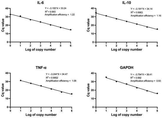 The standard curve of plasmid harboring cytokine genes using qPCR. The plasmid concentrations of 100–106 copies/µL were amplified. Cq values from triplicate measurements were plotted against the logarithm of the copy number of each gene. A linear standard curve was generated with a high correlation coefficient (R2 ≥ 0.9).