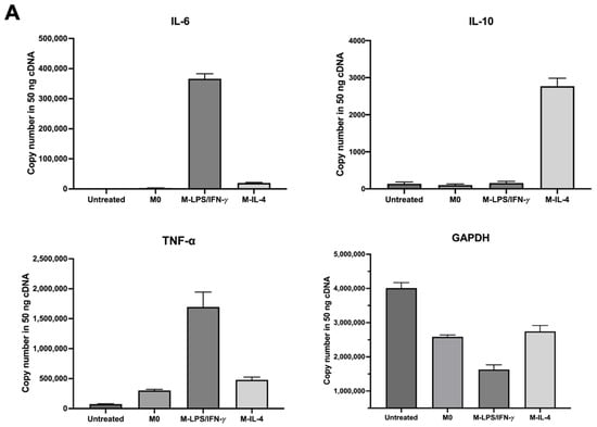 Biomarkers like cytokines are essential for evaluating and monitoring diseases. Macrophages are the main source of cytokines that play pathological roles in various diseases such as infectious diseases, inflammatory bowel disease, rheumatoid arthritis, cancer, and autoimmune diseases []. Generally, macrophages can be polarized into two main subtypes: classical (M1) and alternative (M2) macrophages by a distinct stimulus []. M1-polarized macrophages are characterized by the production of pro-inflammatory cytokines whereas M2-polarized macrophages produce anti-inflammatory cytokines []. Therefore, characterizing macrophage subtypes and their cytokine profiles is crucial for developing cancer therapies and predicting patient outcomes. Quantifying gene expression facilitates the exploration of various human diseases such as inflammation and infection [,].