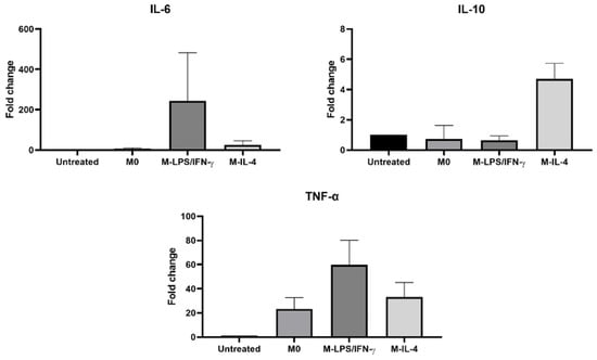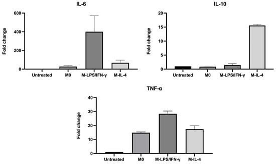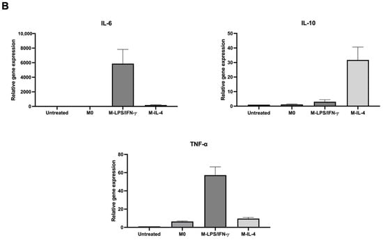 For macrophage polarization, 1 × 106 of THP-1 cells were seeded in a 6-well cell culture plate. The cells were polarized into M0 macrophages by incubation with 61.3 ng/mL of phorbol 12-myristate 13-acetate (PMA) (Sigma-Aldrich, St. Louis, MO, USA) for 6 h. The M0 macrophages were polarized in M1-like (M-LPS/IFN-γ) macrophages by incubation with 5 ng/mL of IFN-γ [] and 10 ng/mL of lipopolysaccharides (Sigma-Aldrich, MO, USA) for 18 h. M2-like (M-IL-4) macrophages were obtained by incubation with 20 ng/mL of interleukin-4 (IL-4) (Invitrogen, Waltham, MA, USA) for 48 h.