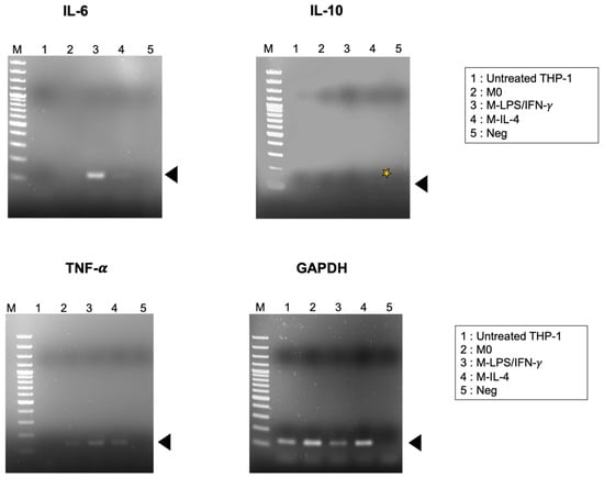 Agarose gel electrophoresis of amplicons for IL-6, IL-10, TNF-α, and GAPDH expressions. To generate M0 macrophage, THP-1 cells were incubated with PMA for 6 h. Subsequently, M0 was treated with LPS and IFN-γ for 18 h or IL-4 for 48 h to establish M-LPS/IFN-γ and M-IL-4 macrophages, respectively. THP-1 and THP-1-derived macrophages were harvested to extract total RNA and synthesized to cDNA. Samples were then subjected to PCR amplification and loaded in agarose gel electrophoresis. Lane 1: PCR product of untreated THP-1 cells; Lane 2: PCR product of M0 macrophage; Lane 3: PCR product of M-LPS/IFN-γ; Lane 4: PCR product of M-IL-4 macrophage; Lane 5: no plasmid control (Neg); M = 100 bp DNA ladder; yellow star = the PCR product of IL-10.
