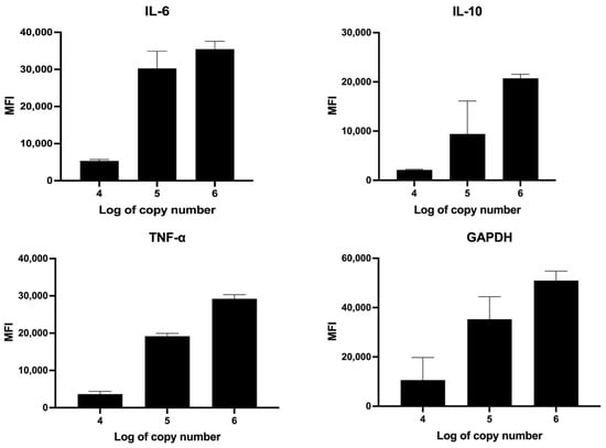 Quantitative detection of recombinant plasmid harboring cytokine genes by MicroDisc singleplex assay. Recombinant plasmid concentrations of 104–106 copies/µL were amplified by PCR. The PCR products of IL-6, IL-10, TNF-α, and GAPDH genes were subjected to hybridization and assessed by the πCode assay. Mean fluorescence intensity (MFI) presented as the mean ± SD from three independent experiments.