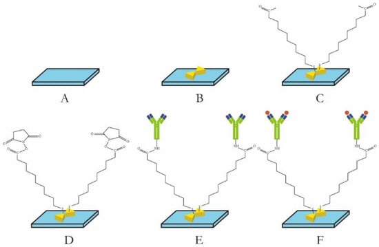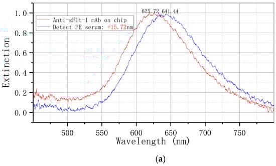 Figure 1). Additionally, an amide bond was formed between the carboxyl end and the amino end of the antibody. The experimental conditions, including the concentration of the coupling agent and the incubation time, were optimized to determine the most effective preparation scheme for the biosensitive layer. Following a 9 h immersion of the metal nanochips in 1 mM MUA at room temperature, the nanochips underwent a cleaning process involving anhydrous ethanol for 5 min, repeated twice, and ultra-pure water for 5 min, once, at a rotational speed of 100 RPM, followed by drying with nitrogen. Subsequently, the chips were immersed in a mixed solution containing 75 mM EDC.HCL, 15 mM NHS and other specified volumes at room temperature for 2 h to activate the surface carboxyl group. This was followed by a washing step with ultra-pure water for 2 min, repeated three times, and drying with nitrogen. A 50 μL amount of a 10 ug/mL solution of anti-human sFlt-1/PLGF monoclonal antibody was added to the chip and incubated at 4 °C for 10 h. The chip was then washed twice with PBS for 5 min each and once with ultra-pure water for 5 min. It was dried with nitrogen gas and stored in a refrigerator at 4 °C for future use.