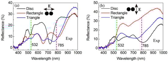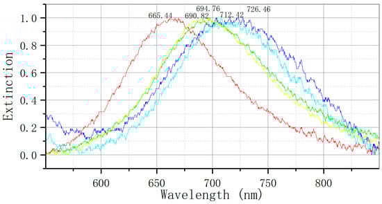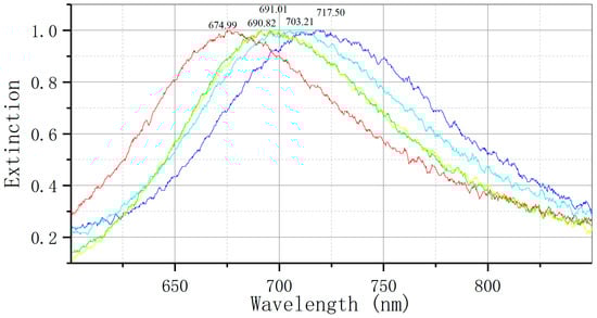 The optical test platform was constructed for the purpose of analyzing the spectrum of the nanoparticle array and investigating the characteristic peak of LSPR. The optical detection unit utilizes an Ocean Optics USB4000 (Shanghai, China) optical fiber spectrometer equipped with a CCD detector. The light source employed is the DH-2000 UV-Vision-near-infrared light source, which emits non-polarized light. All spectral measurements are conducted within the confines of the standard geometric transmission path. The data-processing unit utilizes the spectrum software (OceanView) from Ocean Optics (Dunedin, FL, USA) for image acquisition, and the Origin data-processing software version 9.0 (Northampton, MA, USA) for denoising and analyzing the acquired data.