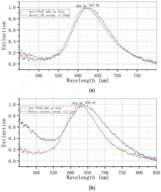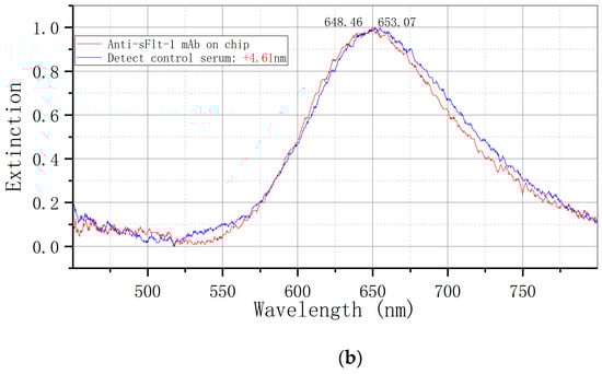The concentration gradient of sFlt-1/PLGF standard protein solution (10 pg/mL, 100 pg/mL, 1 ng/mL, 10 ng/mL, 100 ng/mL, 1 µg/mL, 10 µg/mL) was analyzed by conducting at least three tests for each standard concentration. Mean and standard deviation of the test values for each concentration standard were obtained using OriginPro 9.0 software, and a standard curve was generated along with the corresponding curve equation. The LSPR spectrum undergoes changes following repeated testing (at least 10 times) of the reaction involving the sFlt-1/PLGF diluter. The standard deviation ∆λmax is determined as the detection noise value, with the minimum effective response signal being set at three times the noise value. Regarding peak processing, we maintain consistency in our approach, averaging three detections for target identification.