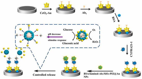 - Huang, Z.; Zhao, L.; Li, Y.; Wang, H.; Ma, H.; Wei, Q.; Wu, D. Glucose Oxidation Induced pH Stimuli Response Controlled Release Electrochemiluminescence Biosensor for Ultrasensitive Detection of CYFRA 21-1. Talanta 2024, 266, 124955. [Google Scholar] [CrossRef] [PubMed]