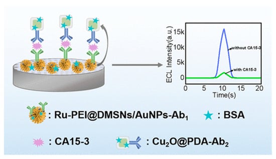 - Wang, W.; Feng, D.; Wang, Y.; Kan, X. Ruthenium Poly(Ethylenimine)/Gold Nanoparticles Immobilized on Dendritic Mesoporous Silica Nanoparticles for a CA15-3 Electrochemiluminescence Immunosensor via Cu 2 O@PDA Dual Quenching. ACS Appl. Nano Mater. 2023, 6, 19271–19278. [Google Scholar] [CrossRef]