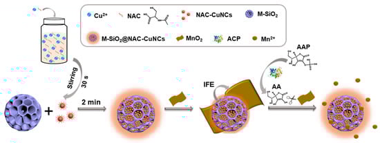 - Chen, S.; Li, Z.; Xue, R.; Huang, Z.; Jia, Q. Confining Copper Nanoclusters in Three Dimensional Mesoporous Silica Particles: Fabrication of an Enhanced Emission Platform for “Turn off-on” Detection of Acid Phosphatase Activity. Anal. Chim. Acta 2022, 1192, 339387. [Google Scholar] [CrossRef] [PubMed]