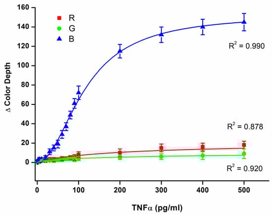 Assay of TNFα solved in PBS using a 3D-printed colorimetric biosensor and a standard 96-well microplate. Color depths for each RGB color channel were determined and calibration curves for each color channel were made. Error bars indicate the standard deviation for five repeats.