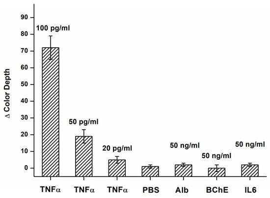 Interference tests for an assay by the colorimetric biosensor in the B channel. Results for various concentrations of TNFα, and solutions of albumin (Alb), butyrylcholinesterase (BChE), interleukin 6 (IL6), and pure PBS are depicted. The difference in color depth was calculated for the B channel. Error bars indicate the standard deviation for five repeats.