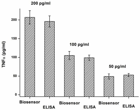 The validation of the biosensor assay to the standard ELISA was another experiment that checked the plausibility of the analytical results. Both ELISA and biosensor analyzed three samples with 50, 100, and 200 pg/mL TNFα concentrations, and the results of the assays were recalculated to concentrations using calibration plots. The validation results are depicted in Figure 6. The quality of antibodies used in the assay should be considered. The low interference of the tested proteins and reliable validation tests are mainly based on the specificity of antibodies used in the assay. The biosensor assay will have the same limitations as the ELISA method. When the two methods are compared together, the biosensor assay has a lower sensitivity, but it is a substantially simpler assay. The lower sensitivity is not a significant problem because the purpose of the assay is to reveal serious pathologies in the first screening, and the level of TNFα is quite high in these pathologies.