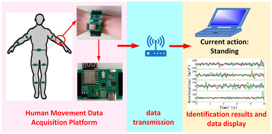 The wearable human movement recognition method designed in this paper consists of nine wearable devices worn on the left or right upper arm, forearm, thigh, calf, or waist center to collect movement data. When the human movement data acquisition platform completed the data collection, the data were transmitted to a computer, as shown in Figure 1.
