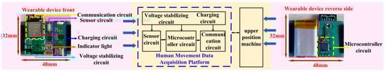 The human action data acquisition platform is composed of a microcontroller circuit, sensor circuit, voltage regulator circuit, charging circuit, and communication circuit, as shown in Figure 2.