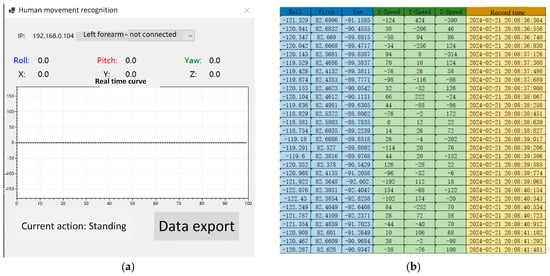 - Data storage area: The movement data under different movements of the human body can be stored. Different movement data of different body parts can be selected according to the data selection area. After freely setting the storage path, the acceleration and angular velocity data under the current motion state are stored as a table, as shown in Figure 3b.