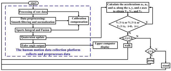 - When i I3 is used, the current output of the human body is the jumping action; otherwise, the current output of the human body is the standing action. The algorithm flow chart is shown in Figure 4 (I1, I2, and I3 are the set numbers of sensors).