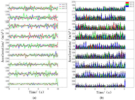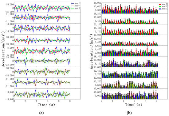 In this experiment, after volunteers wore wearable devices on the corresponding parts of the body, the data on volunteers’ standing, walking, and jumping movements were collected at different times and places. The threshold algorithm was run on the computer terminal of the Microsoft Windows 10 operating system, and the three kinds of motor action classifications of volunteers were tested through the fusion of the threshold algorithm and data filtering. This experiment takes 0.2 s as the time interval for data collection. The collected motion data are as follows. In the standing state, the acceleration data of each part change gradually, and the values after absolute value processing are concentrated in the range of 20 m/s2 to 200 m/s2. Most sensor data also reflect this trend, as shown in Figure 5. During walking, the acceleration of specific body parts fluctuates, and after absolute value processing, the value range expands from 2000 m/s2 to 10,000 m/s2. The data of different sensors at the same time point were distributed in two ranges, from 2000 m/s2 to 5000 m/s2 and from 5000 m/s2 to 10,000 m/s2, as shown in Figure 6. For jumping movements, the acceleration data of almost all body parts showed significant fluctuations, the absolute value increased significantly to between 9000 m/s2 and 25,000 m/s2, and most sensors recorded values exceeding 10,000 m/s2, as shown in Figure 7.