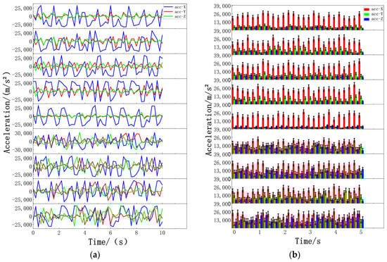 Jump data of nine sensors: (a) Acceleration jump data of nine sensors. (b) Jumping data of absolute acceleration values from nine sensors. The nine figures from top to bottom are data graphs of the following parts: left forearm, left upper arm, right forearm, right upper arm, middle waist, left calf, left thigh, right calf, and right thigh.