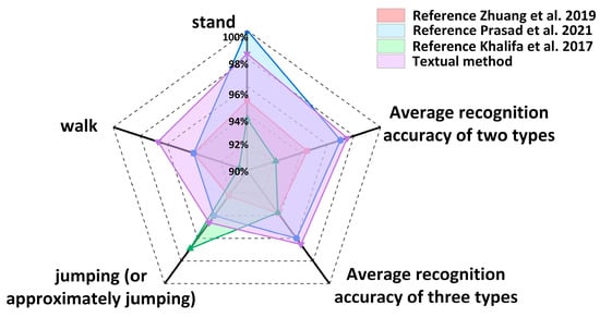 This paper compares and analyzes relevant literature in the field of human motion recognition. Zhuang et al. [37] used a single six-axis sensor to collect data, combined time domain and frequency domain analysis, and used the multiclass classification technology of a support vector machine for motion pattern recognition. Prasad et al. [38] used smartphone accelerometers to collect data and applied convolutional neural networks for recognition. Khalifa et al. [39] also used mobile phone accelerometers to distinguish different behaviors by setting different thresholds. In this study, studies using different sensor technologies and recognition algorithms were selected to compare the recognition accuracy of standing, walking, and jumping (or approximately jumping) movements, as well as the average recognition accuracy of two or three types of movements. The specific results are shown in Table 2 and Figure 8. The recognition accuracy of [37] is relatively low, and the accuracy of [38] is relatively high, but the algorithm has a certain complexity, and the accuracy of [39] is low during the recognition walk. The results of the data analysis show that the recognition method proposed in this paper is superior to other schemes in terms of recognition efficiency because it not only improves the recognition accuracy but also successfully simplifies the algorithm structure and reduces the need for computing resources.