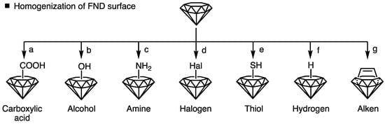 Chemistry for Homogenization of FND surfaces. (a) Carboxylation, (b) hydroxylation, (c) amination, (d) halogenation, (e) thiolation, (f) hydrogenation, and (g) thermal annealing for terminating with unsaturated sp2 carbons (alken).