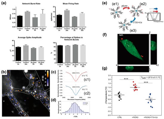 FNDs-based Intracellular temperature measurements. (a–c) Intracellular temperature mapping using non-neurotoxic FNDs. (a) Neuronal activity parameter comparison between control (non-FNDs) and FNDs-treated neurons. The parameters are network burst rate, mean firing rate, average spike, amplitude, and percentage of spikes in the network bursts. (b) Intracellular temperature mapping of primary cortical neurons using FNDs. The image was captured at 37.3 °C. (c) Typical ODMR spectra captured at (c1) 37.3 °C and (c2) 35.2 °C. (d) Histogram of temperature fluctuations measured from 255 FNDs. Reprinted with permission from []. (e–g) Detection of neural activities-induced intracellular temperature elevations using FNDs. (e) Schematics depicting FNDs-based temperature measurements (e1) under control (CTRL) conditions, (e2) after chemical potentiation of neural activities by picrotoxin (picro), and (e3) after chemical inhibition of neural activities by tetrodotoxin and cadmium chloride (TTX+Cd). (f) Confocal fluorescent images of hippocampal neurons treated with FNDs. Green, cytoplasm; red, FNDs. White arrows represent a FND nanoparticle internalized within a cell. (g) Plots of intracellular temperature fluctuations measured by FNDs. The asterisks indicate a statistical difference (***, p < 0.0001). The measurements were conducted as illustrated in Figure 2e. Reprinted with permission from [].