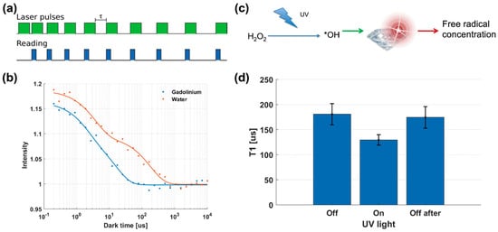 A study on T1 measurements using FNDs was conducted to verify whether the detection of spin noise under biologically relevant conditions and real-time detection of free radicals were possible (Figure 4) []. T1 measurements using FNDs were performed in water, phosphate-buffered saline (PBS), and cell culture medium. Gd3+, a commonly used contrast agent, was used as the test sample. T1 measurements for FNDs in water and PBS provided comparable T1 relaxation times, whereas T1 measurements for FNDs in the medium offered a shorter T1 relaxation time than those for FNDs in water and PBS owing to protein adsorption on the FND surfaces. Thereafter, the FNDs were utilized for the real-time detection of free radicals generated by photolysis, because the photolysis of hydrogen peroxide is a biologically important reaction. T1 measurements for the FNDs before, under, and after ultraviolet (UV) irradiation showed a reduced T1 relaxation time when hydrogen peroxide was irradiated with UV radiation, indicating that the FNDs could detect free radicals generated by photolysis in real time. Moreover, the photostability of FNDs allows for the repeated measurement of free radicals with nanoscale spatial resolution without photobleaching. In summary, the verification of FND-based T1 measurements under biologically relevant conditions provides fundamental insights for free-radical sensing in living cells and organisms.