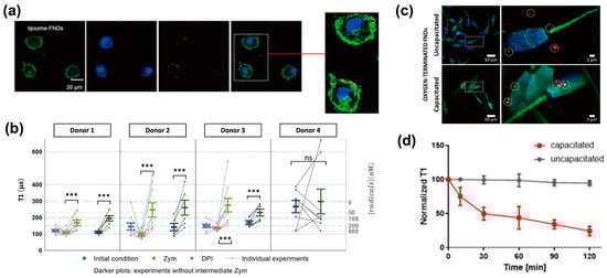 Thereafter, three studies demonstrating free radical detection within cells were performed. First, FNDs internalized by J774 macrophages were used to detect intracellular free radicals, including NO* []. A time series of T1 measurements using intracellular FNDs revealed a change in the T1 relaxation time when macrophages were chemically stimulated by NO* production inhibitors. The results of FND-based monitoring of NO* production at the single-cell level were supported by free radical detection using a conventional fluorescent probe, demonstrating the ability of FNDs to sense NO* production within a cell. This monitoring revealed that individual macrophages exhibited heterogeneity in the dynamics of NO* production in response to chemical stimulation. Second, free radical detection using liposome-coated FNDs was demonstrated in primary human dendritic cells (DCs; Figure 5a,b) []. DCs from donors have different endocytosis and free radical production abilities than cell lines, so the utilization of FND-based free radical sensing in primary cells is biologically and clinically important. The uptake of FNDs by primary DCs was assisted by a liposome coating with no significant cytotoxicity, and the internalized FNDs were confirmed to localize to the endophagosome. T1 measurements utilizing intracellular FNDs enabled the quantification of free radical production by nicotinamide adenine dinucleotide phosphate (NADPH) oxidase within cells. Moreover, T1 measurements revealed that the free radical concentration within a cell fluctuated due to chemical potentiation and inhibition of intracellular NADPH oxidase, and DCs showed heterogeneity in free radical production between donors. Finally, FND-based sensing of free radicals in single sperm cells was performed to identify the source of free radicals during sperm maturation (Figure 5c,d) []. FNDs with oxygen-terminated surfaces effectively labeled sperm cells and labeling sperm cells with FNDs did not reduce cell activity or viability. T1 measurements using FNDs with oxygen-terminated surfaces enabled the local detection of free radicals in sperm cells. These measurements revealed altered concentrations of localized free radicals in the capacitated and uncapacitated sperm cells. A combination of FND-based T1 measurements and chemical inhibition of free radical production has contributed to the identification of the source of free radicals during sperm capacitation. These examples emphasize that the advantages of FND-based free-radical sensing are real-time, continuous, and high spatial resolution compared to conventional spin labels and fluorescent probes. Thus, nanoscale detection of free radicals using FNDs is a powerful tool for revealing the roles played by free radicals during biological processes.