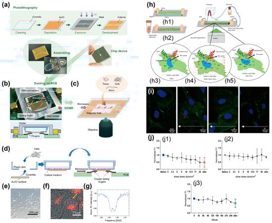 FNDs-based on-chip biosensing with enhanced reproducibility and fluidic controllability. (a–g) A notch-shaped coplanar antenna structure for spatially uniform microwave irradiation. (a) Schematics depicting fabrication process of a chip device with the coplanar antenna. (b) A schematic and photo of the chip device docked with a dish and a printed circuit board (PCB). (c) A schematic showing microwave irradiation to biological samples via the coplanar antenna. (d) Schematics depicting cell culture on the chip device and ODMR measurement. (e) A photo of living HeLa cells cultured on the chip device. (f) A merged bright-field image with fluorescence of intracellular FNDs. (g) An ODMR spectra that was captured from a yellow arrow in Figure 6f. Reprinted with permission from []. (h–j) Real-time detection of intracellular free-radicals inside a microchannel. (h) Schematics depicting (h1) HUVEC culture, (h2) FND uptakes, and (h3–h5) free-radical detection (h3) before flow, (h4) under shear stress, (h5) after flow. (i) Confocal fluorescent images of FND-labeled HUVECs inside a microchannel with and without shear stress. (j) T1 curves of FNDs with and without HUVECs under the shear stress conditions. (j1) FNDs inside HUVECs and (j2) FNDs in a microchannel were measured under the flow rate from 2 to 20 dyne/cm2. (j3) FNDs inside HUVECs were measured under the flow rate from 4 dyne/cm2 for 4 h. Reprinted with permission from [].