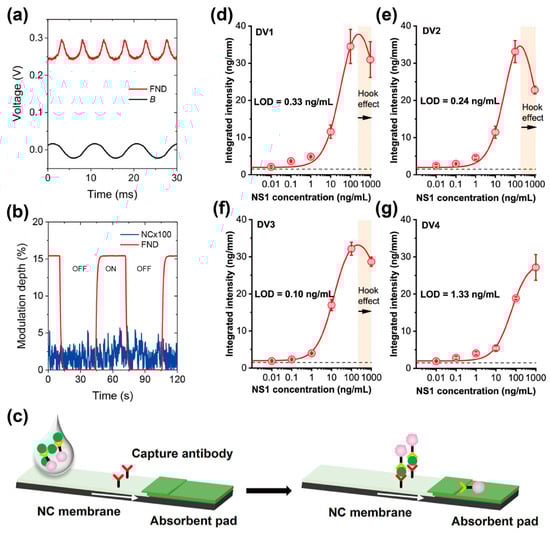 Spin-enhanced lateral flow immunoassay. (a,b) The modulated fluorescent intensity of FNDs by irradiating the alternating current (AC) magnetic field. (a) The fluorescent intensity of FNDs on a NC membrane under the irradiation of the AC magnetic field. The fluorescent intensity and the magnetic field were measured by a photomultiplier tube and a Gauss meter, respectively. (b) Time traces of modulated fluorescent intensities from FNDs and a NC membrane under the exposure to the AC magnetic field. Reprinted with permission from []. (c–g) Lateral flow immunoassay using FNDs. (c) Schematics depicting a sandwich-based lateral flow immunoassay using FNDs. FNDs were conjugated with anti-dengue antibodies via physical adsorption, and NS1 antigens were labeled with the antibodies-FND prior to flowing into a NC membrane. (d–g) Calibration curves and limit of detection (LOD) of spin-enhanced lateral flow immunoassay for assaying different serotypes of dengue virus ((d), DV1; (e), DV2; (f), DV3; (g), DV4). Reprinted with permission from [].