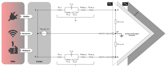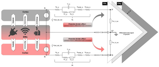 where , , and are the displacement current from points to point . Therefore, the EMIs introduced by the signal electrode () and reference electrode () in relation to the IC ground are as follows:
