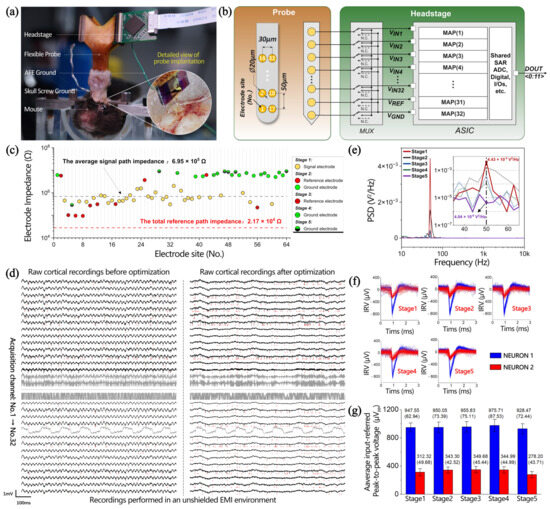 In the fifth stage (i.e., the final stage after optimization), six ground electrodes were added based on the fourth stage, bringing the total number of ground electrodes to 22. This leads to the introduction of a parallel ground path impedance of 1.51 × 105 Ω based on the skull ground impedance (kΩ order of magnitude). Although such an introduction has little effect on the change in the path impedance of the ground electrode, the interference is greatly reduced due to the change in inter-electrode impedance ( and/or ). Compared with the 50 Hz interference before optimization, the optimized results have no obvious interference, as revealed in Figure 6d. Compared to the first stage, the PSD of the 50 Hz interference decreased by 1096 times and remained at 4.04 × 10−6 V2/Hz. Although there is a slight decrease in the input-referred peak-to-peak spike voltage of the two neurons, there is still no significant attenuation considered due to the reasonable fluctuations within the standard deviation.