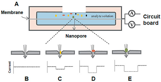 Basic scheme of nanopore-based sensing. (A) Two chambers are filled with an electrolyte solution and a voltage is applied across the system. Analytes, represented by multi-colored circles, are then added into one chamber and as each analyte passes through the aperture in the direction shown by the arrow, both dwell times and intensity of current blockades change based on the size and shape of the analyte (B–E). Reproduced with permission [7].