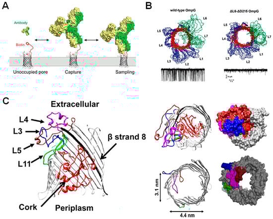 In the last decade, the loops of OmpG have been used as tethers for sensing molecules, equipping this nanopore with greater sensing capabilities (Figure 3A) [19]. However, removing or restricting L6 to produce a “quiet” pore (Figure 3B) allows for accurate sensing ability in a wider range of conditions [52,53], indicating that there may be as-yet unidentified advantages to loop deletion in this system. For FhuA, on the other hand, removal of its cork and extracellular loops is essential for an analyte to traverse the pore [48]. The most commonly used form of this pore is the tFhuA (or TL-FhuA) mutant, as it demonstrates significantly enhanced unitary conductance. In this mutant, the 160-residue cork domain and five extracellular loops (L3–L5, L10, and L11) were deleted, and a 6-His tag with a [PA]3 linker was added to the N-terminus (Figure 3C). Although it is not clear which mutation specifically allows for the reported high unitary conductance, Thakur et al. postulate that it is most likely due to an accidental increase in the diameter of the pore entrance [54]. Since this discovery, Movileanu et al. have shown that, by attaching specific monobodies to the N-terminus of the protein, the tFhuA pore can be used as a generalized sensor for biomarkers in serum [21,50].